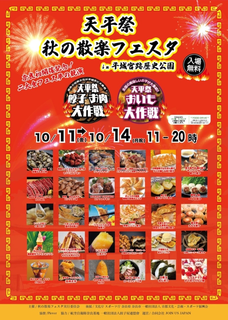 また、「天平祭秋の散楽フェスタ」は奈良初開催となる「餃子お肉大作戦」と「おいも大作戦」の二大食フェス夢の競演がありました。