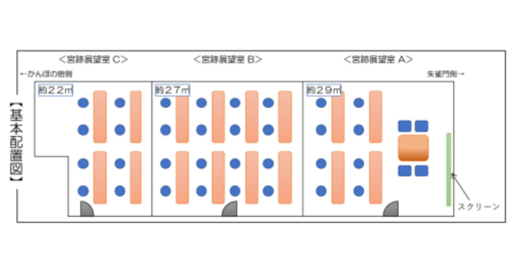 宮跡展望室(会議室)の広さは、A室、B室、C室で異なっております。