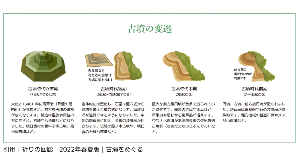 また、古墳はその築造された時代とともに、形状や規模を変遷させてきたようです。