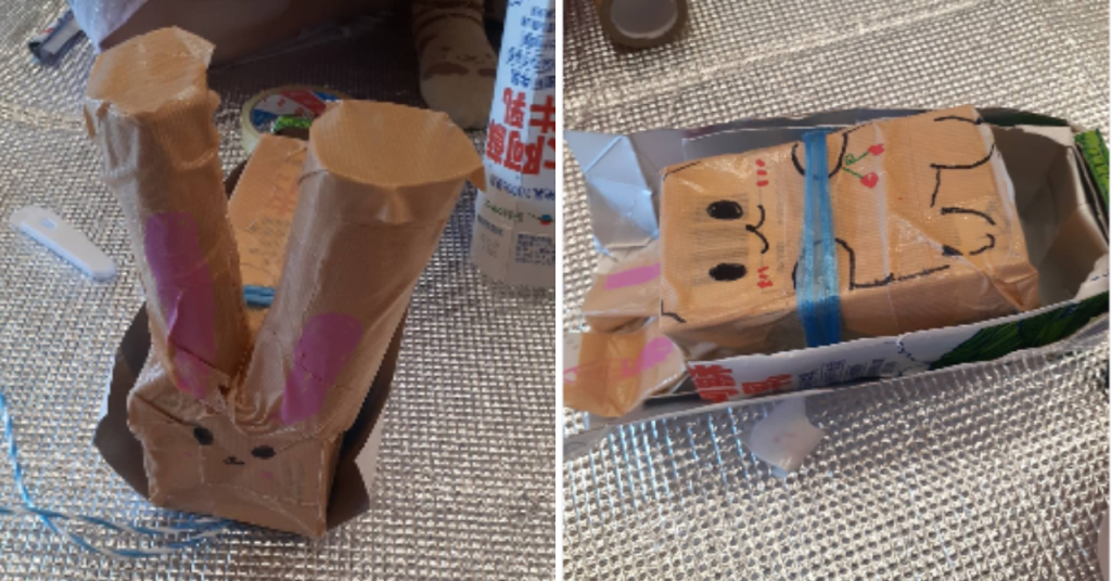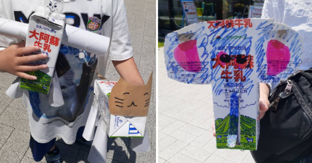 使用した素材は、身近な牛乳パックとトイレットペーパーの芯のみ。
