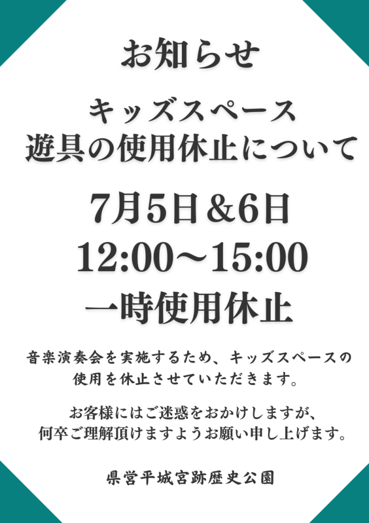 【お知らせ】7月5日&6日キッズスペースの利用について