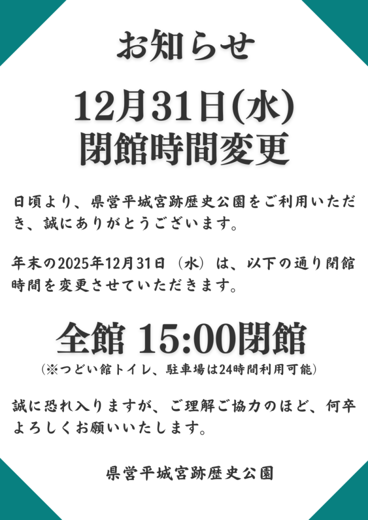 誠に勝手ながら、年末の2025年12月31日(水)は、以下の通り、閉館時間を変更させていただきます。