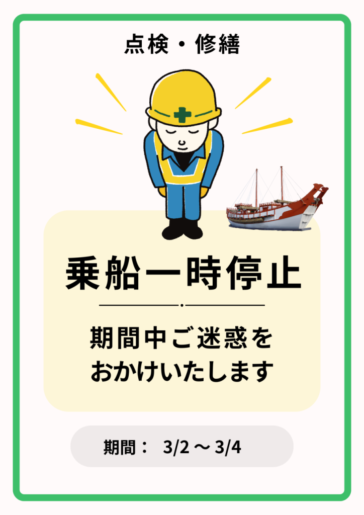 復原遣唐使船の点検・修繕に伴い、下記期間は乗船を一時停止させていただきます。